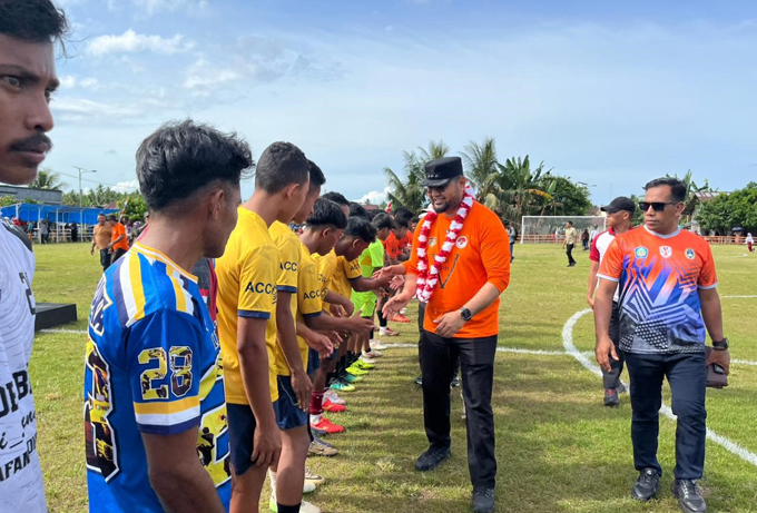 HALSEL, JN- Bupati Halmahera Selatan, Provinsi Maluku Utara, Hasan Ali Bassam Kasuba melakukan tendangan perdana sebagai tanda dimulainya Turnamen sepak bola Bisui Cup ke-V tahun 2025, sekaligus penyerahan secara simbolis perlengkapan pertandingan berupa kaos tim dan bola kaki kepada panitia pelaksana.