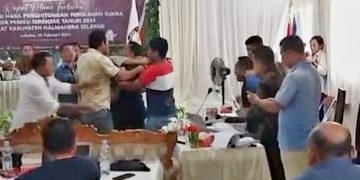 Diketahui berdasarkan hasil pantauan JaretNews.com, pada Selasa (05/03/2024) terjadi aksi bakuhantam antara Saksi, PPK dan Bawaslu, aksi ini berlangsung hingga keluar ruangan pleno, untung saja aksi ini dapat dicegat puluhan aparat Kepolisian. (*)